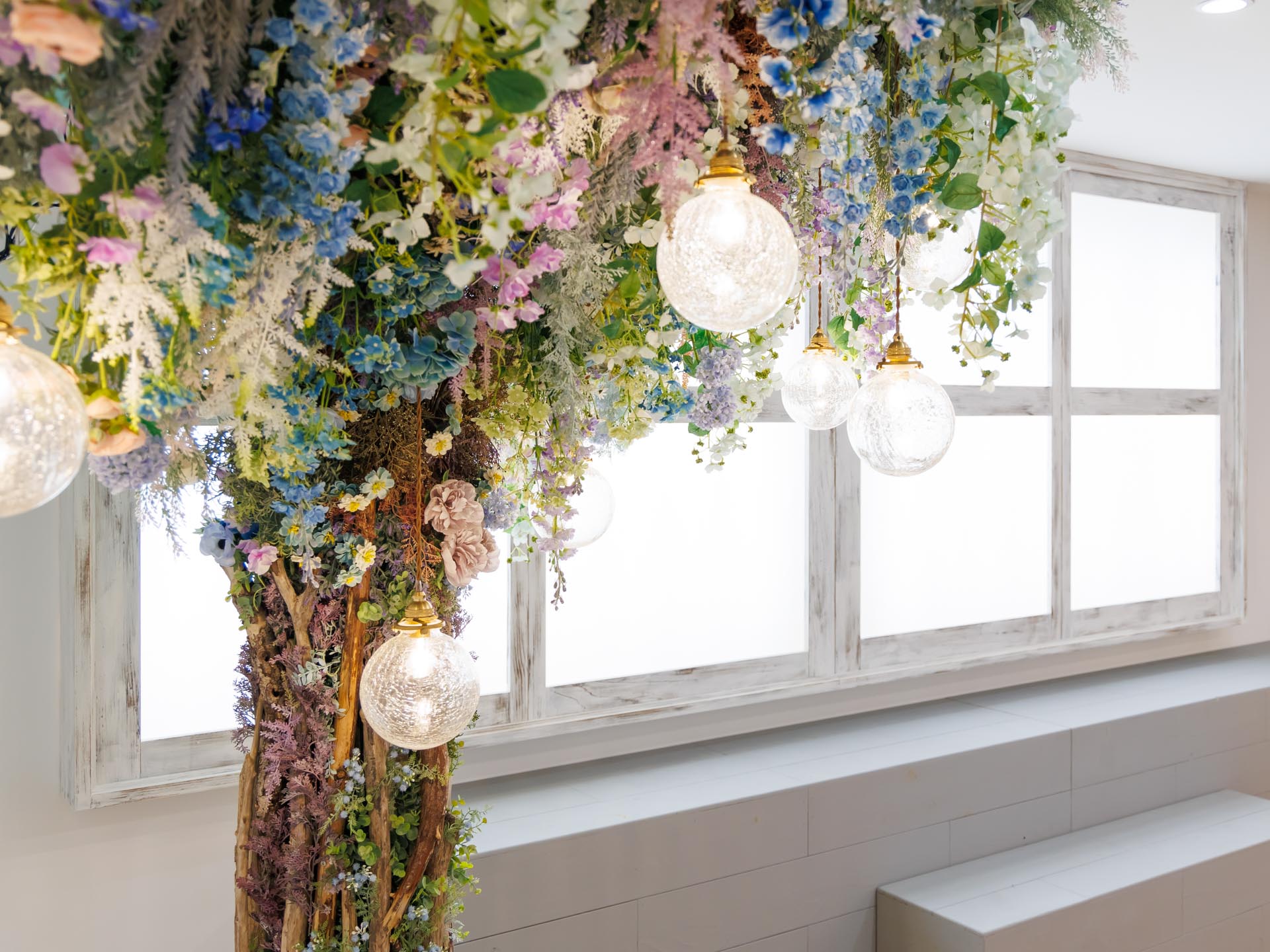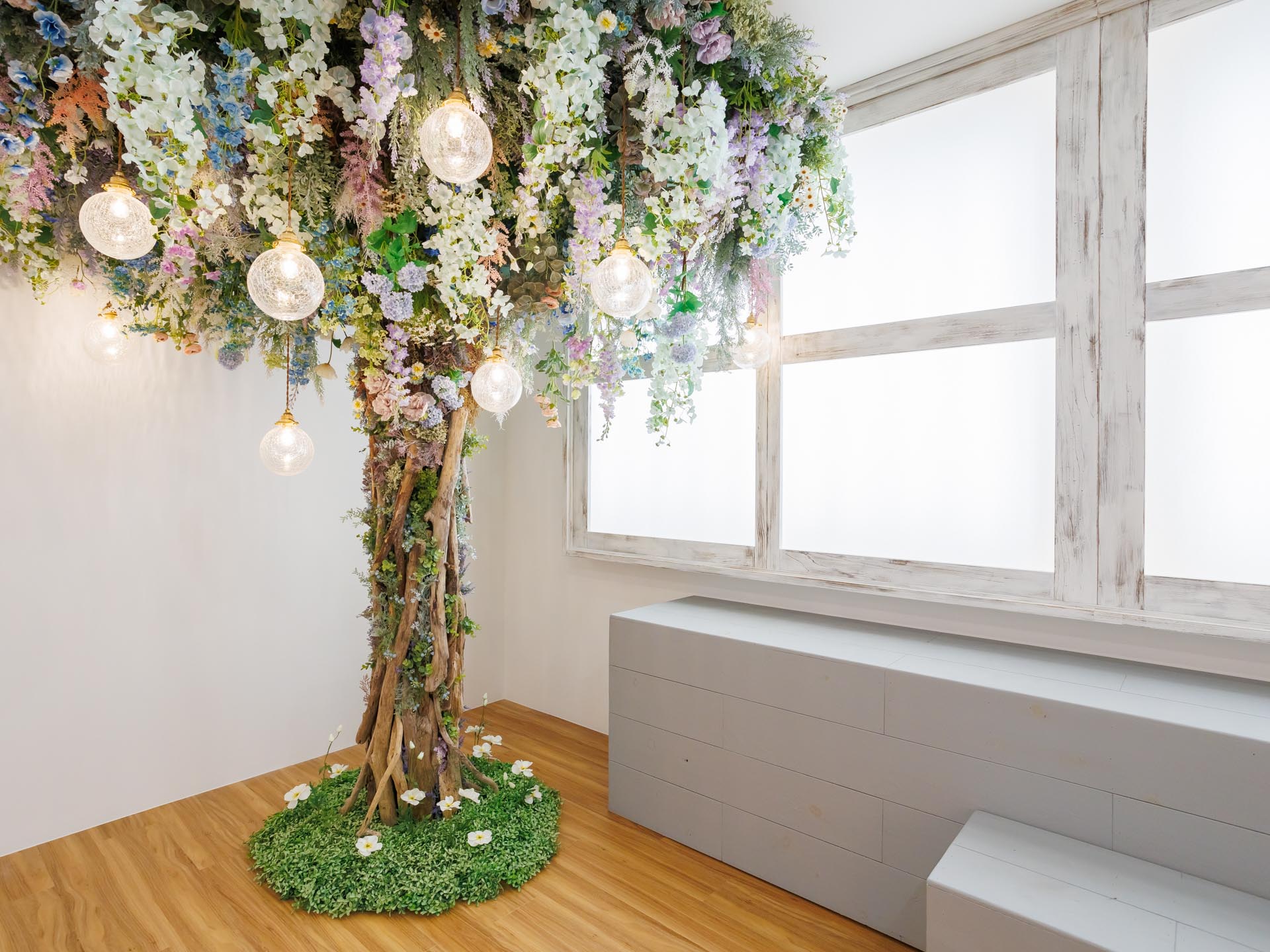 床から天井までのツリーと花と照らすライト、そして大きな窓。